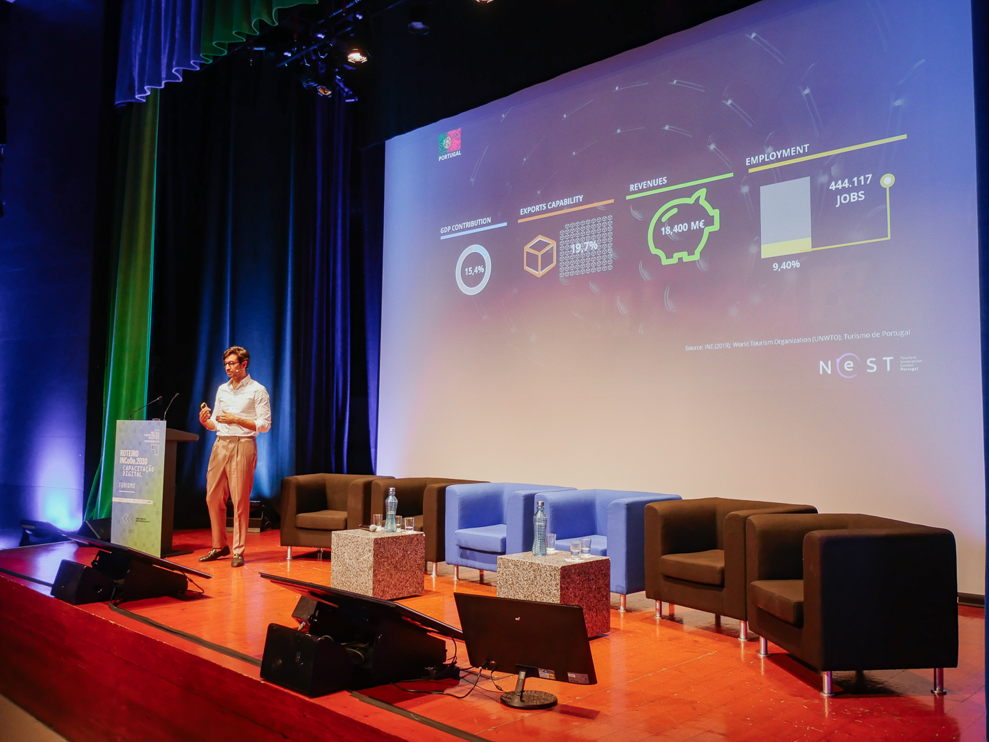This was followed by a presentation by Roberto Antunes from NEST Portugal on Tourism and Innovation, and the panel dedicated to the event's theme, Tourism, which was moderated by Ricardo Sobral from Rickytravel, and with interventions by Ana Caldeira from Turismo de Portugal, André Corcos from Vila Galé Hotéis, André Gomes from Turismo do Algarve and Cláudia Almeida from the Escola Superior de Gestão, Hotelaria e Turismo (Universidade do Algarve UAlg).
